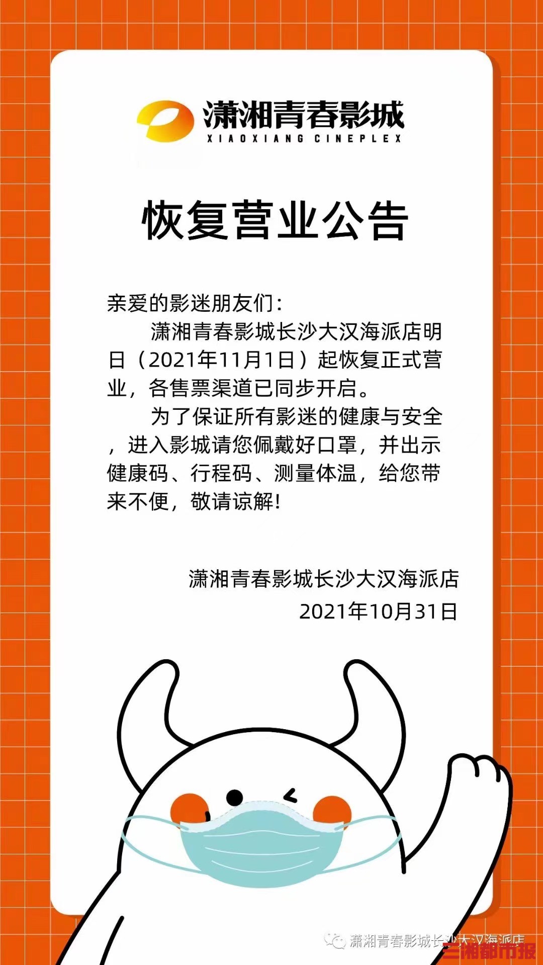 三湘都市报·新湖南客户端11月1日讯(全媒体记者 陈舒仪 视频 何佳洁)今日,长沙市多家影城发布消息宣布恢复营业。上午10点,记者采访多位影院经理,据介绍,多家影院今天已重新开放。据潇湘国际影城长沙东塘店经理张琼介绍,潇湘青春影城/潇湘国际影城长沙5家门店(悦方巨幕店、大汉海派店、阿波罗店、东塘店、天马店)今日起恢复营业。