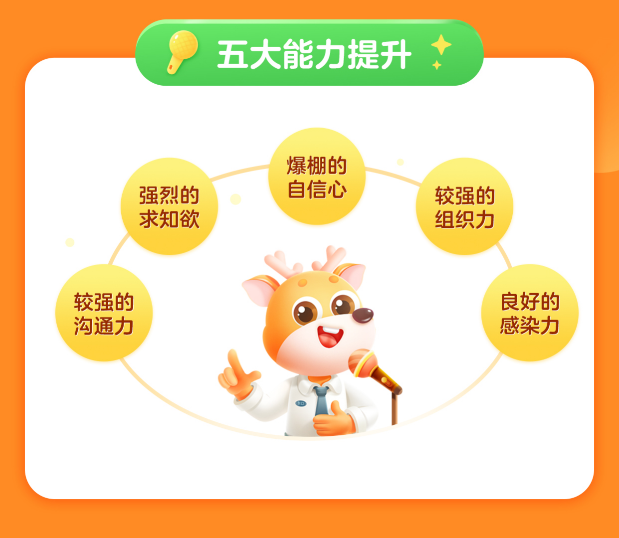 在小鹿口才,孩子通过学习十大语言表达类型,包括朗诵朗读、语言表演、讲述叙事、沟通交流、采访报道、主持主播、推荐介绍、演讲演说、思辨应答、汇报说明,来获得五大综合素养提升:自信的心态,求知的意愿,较强的沟通能力,较强的组织能力,良好的同伴关系。
