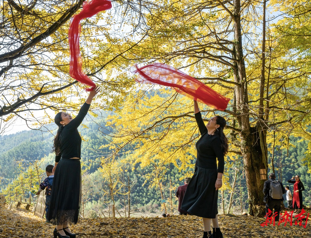 新湖南客户端11月5日讯(记者 詹娉俏 杨鸿雁 通讯员 谭显润)近日,湖南邵阳市城步县儒林镇罗家水村,5棵平均树龄在1080年的古银杏树,进入了一年中最佳观赏期,慕名前来打卡的游客络绎不绝。城步旗袍美女手执羽扇或油纸伞,演绎苗乡秋天最美风景。