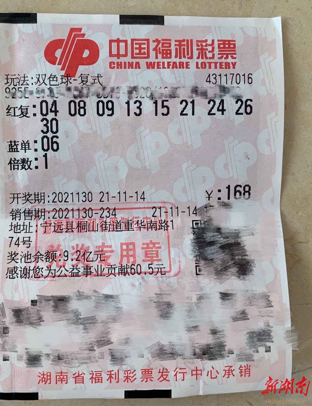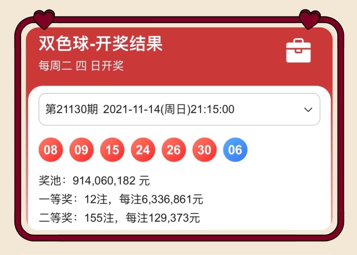 11月14日晚,中国福利彩票双色球游戏进行第2021130期开奖。本期双色球红球号码为15、24、26、30、09、08,蓝球号码为06。本期双色球一等奖中出12注,单注奖金为633万元,其中,湖南1注,中奖福地为:永州市宁远县桐山街道重华南路174号43117016投注站。