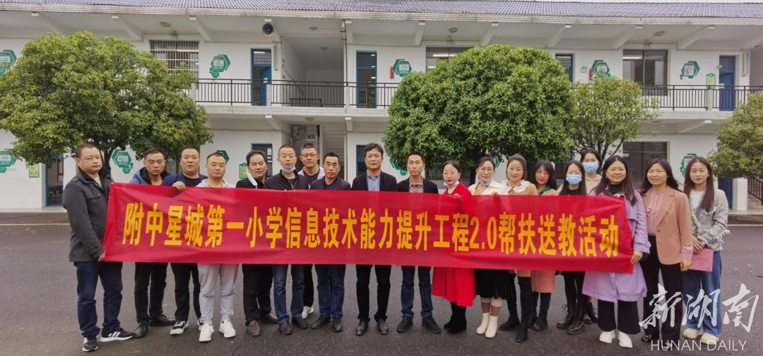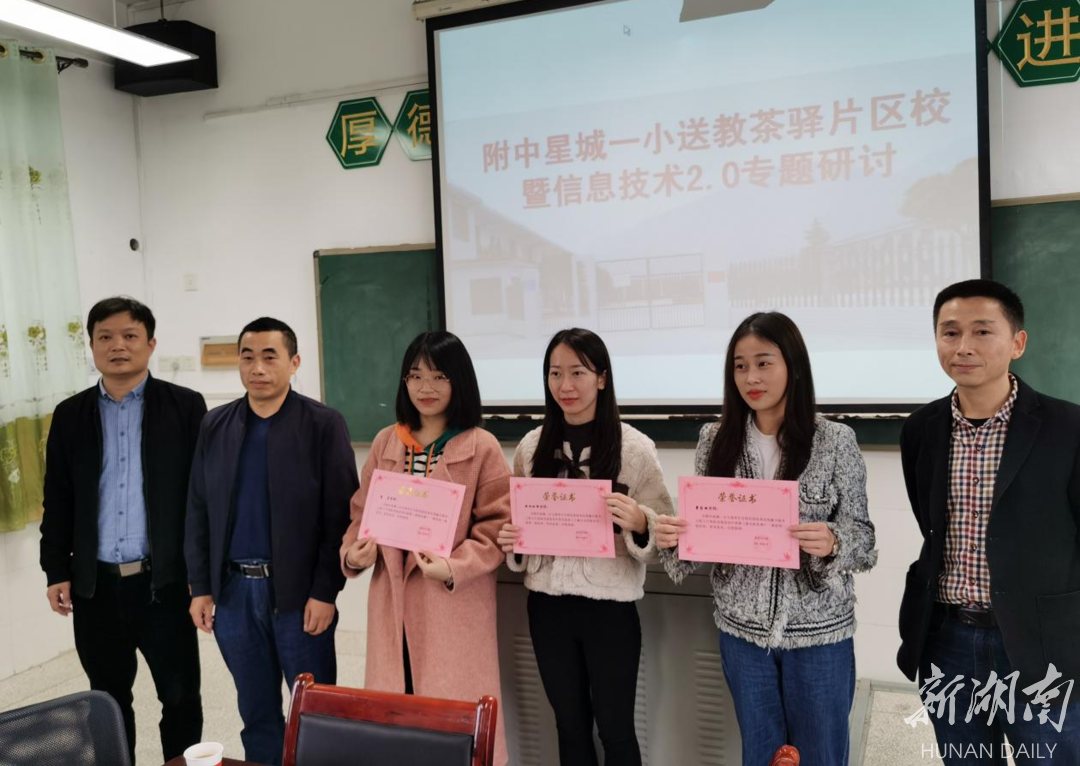 新湖南客户端11月4日讯(通讯员 雷婉淳)为了更好地加强片区校之间的联系,促进教师之间关于信息技术能力提升工程2.0的交流学习,日前,湖南师大附中星城实验第一小学(下称附中星城一小)校长欧阳韬、工会主席舒利英、课程教学处主任骆学林带领学校青年教师前往望城区桥驿镇杨桥学校送上精心准备的信息技术优质课和信息化教学分享,并就信息技术能力提升工程2.0进行结对帮扶活动。