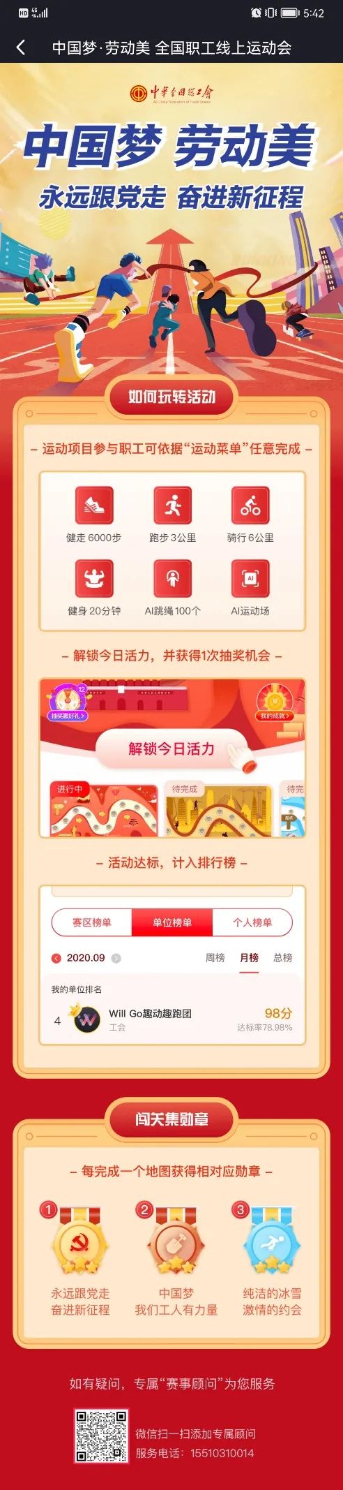 3.参赛职工参与办法:参赛职工收到本单位管理员发送的邀请(二维码/链接),点击进入,根据提示填写个人信息,提交信息申请加入本单位运动团,下载WillGo App直接参与“中国梦·劳动美——永远跟党走奋进新征程”线上运动会。职工使用WillGo App记录每日运动数据并保存记录,每日数据参赛者可查阅。