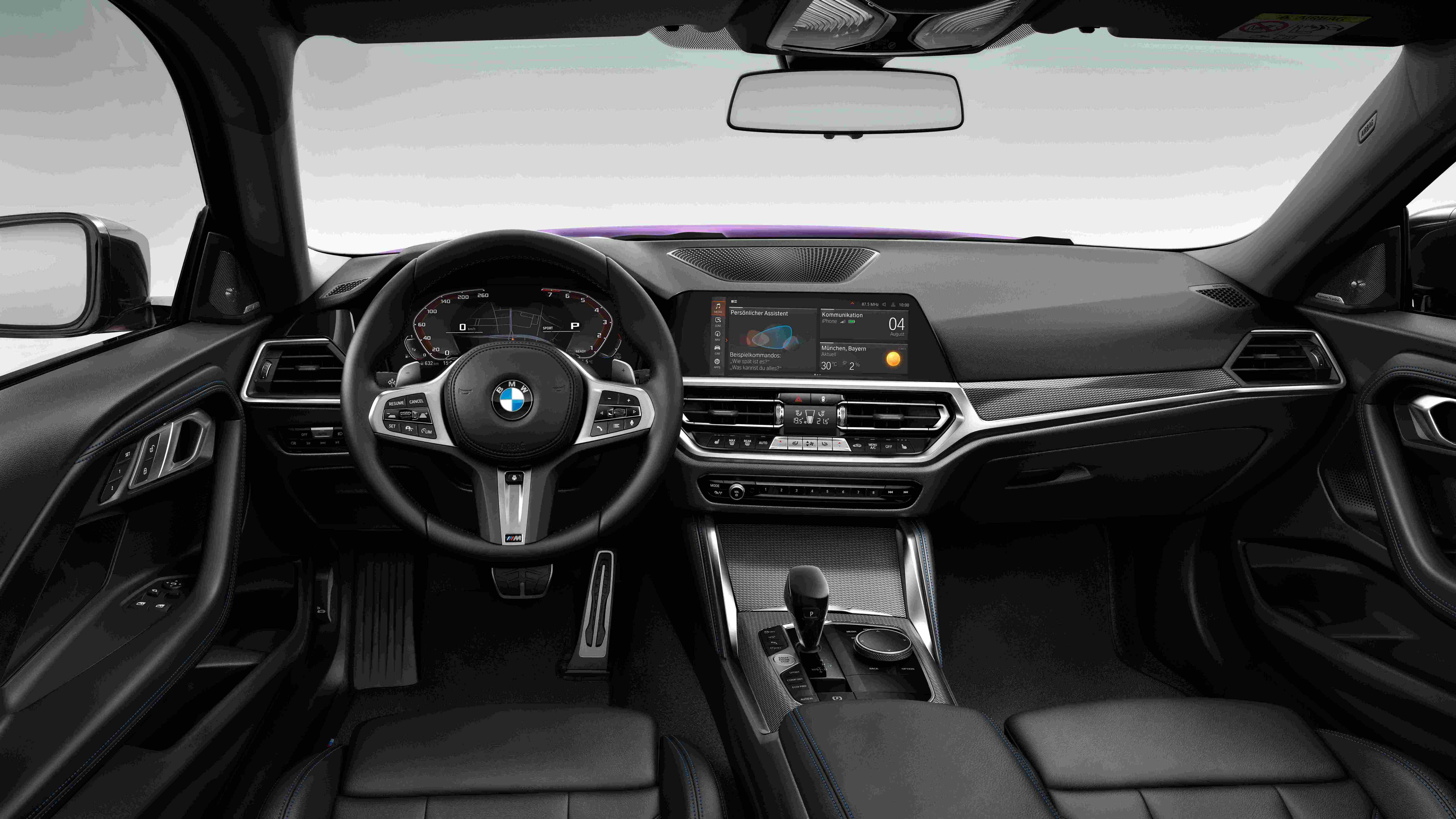 全新BMW 2系双门轿跑车的内饰专为极致驾驶体验而打造,拥有独具创新的车辆驾控体验和数字化互联功能,营造出越级豪华的舒适体验和动感十足的内饰氛围。驾驶舱采用以驾驶员为中心的设计理念,逐渐倾斜的车顶线条、抬高的中控台、以及流线型的仪表板和门板,给驾驶员和前排乘客带来一种环绕式的包围感。车辆还标配M运动型多功能真皮方向盘和前排运动型座椅,并可选装一体式M运动座椅、M三色条纹前排安全带,体验M专属驾驶乐趣。