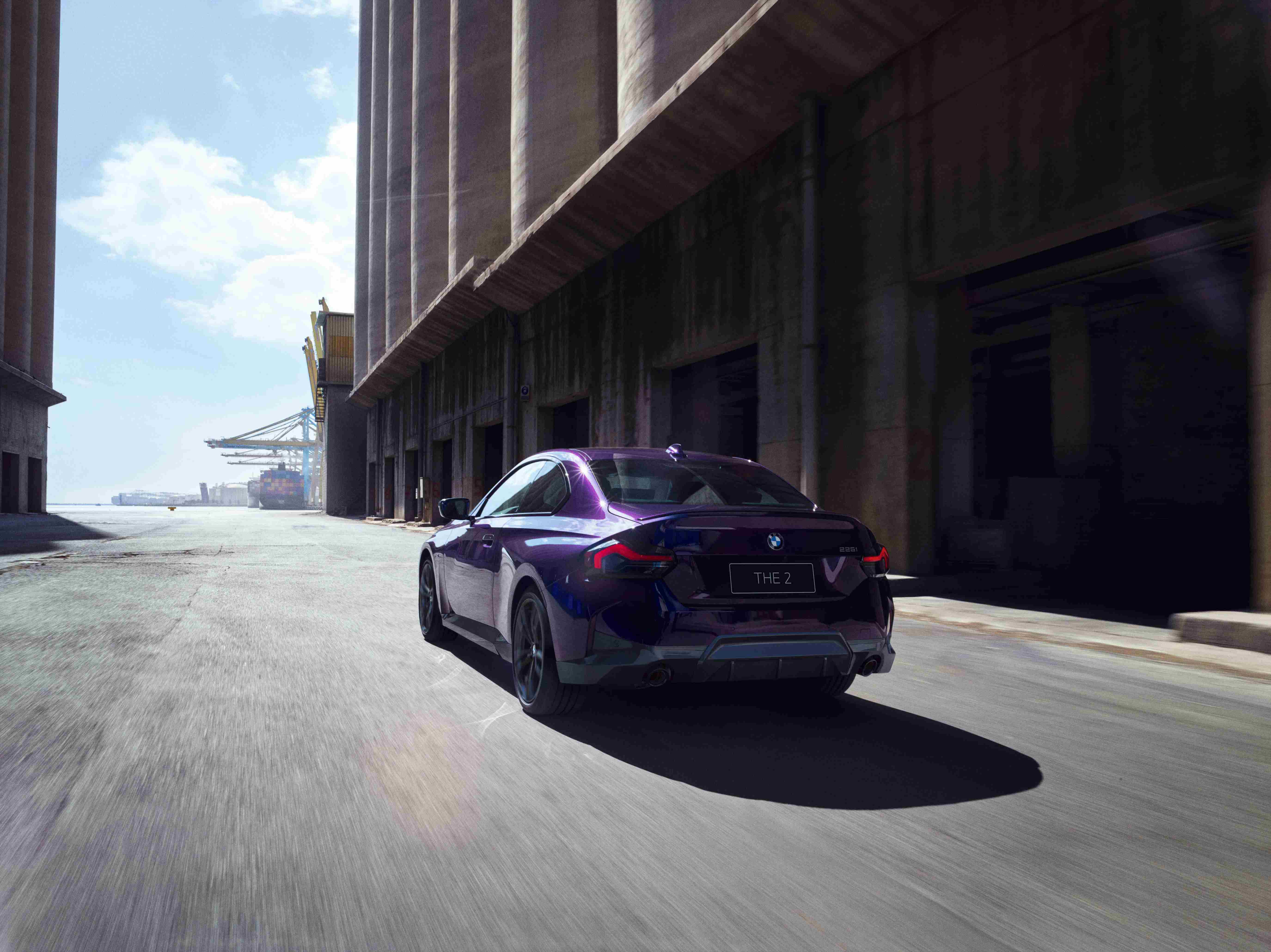 从车身侧面看,修长的发动机舱、短前悬和靠后的座椅布局沿袭了宝马经典跑车的车身比例,塑造出动感而修长的身姿。硬朗的肩线从前大灯开始,沿车身侧面贯穿前后,一直延伸到尾灯区域,与精心设计的侧裙造型相得益彰,赋予车门区域简洁紧凑的美感。轮拱曲面充满肌肉感,配合全新设计19英寸M铝合金轮圈、以及轿跑车无框式车门,彰显了新车标志性的运动侧颜。横向拉伸的水平线条设计赋予全新BMW 2系双门轿跑车独特的尾部造型,微微上扬的M后扰流板进一步增强了车尾的视觉冲击力。LED尾灯采用3D立体悬浮设计,并创新性地使用了向下弯曲的L造型,夺目的光影效果,勾勒出独树一帜的运动美感。新车尾部的后扩散器经过精心设计,扰流造型简约且大气,搭配双边单出排气尾管布局,强化了尾部的运动风格。新车还将提供多达7种车身涂装供消费者选择,其中新增的闪电紫是为全新BMW 2系双门轿跑车专属打造,令新车有如一道闪电划破夜空,散发出神秘而高贵的运动气质。