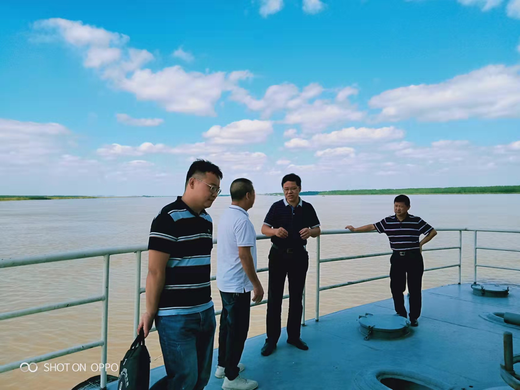 (岳阳市水利局和华容县水利局负责人检查城关二水厂供水泵船的运行情况)