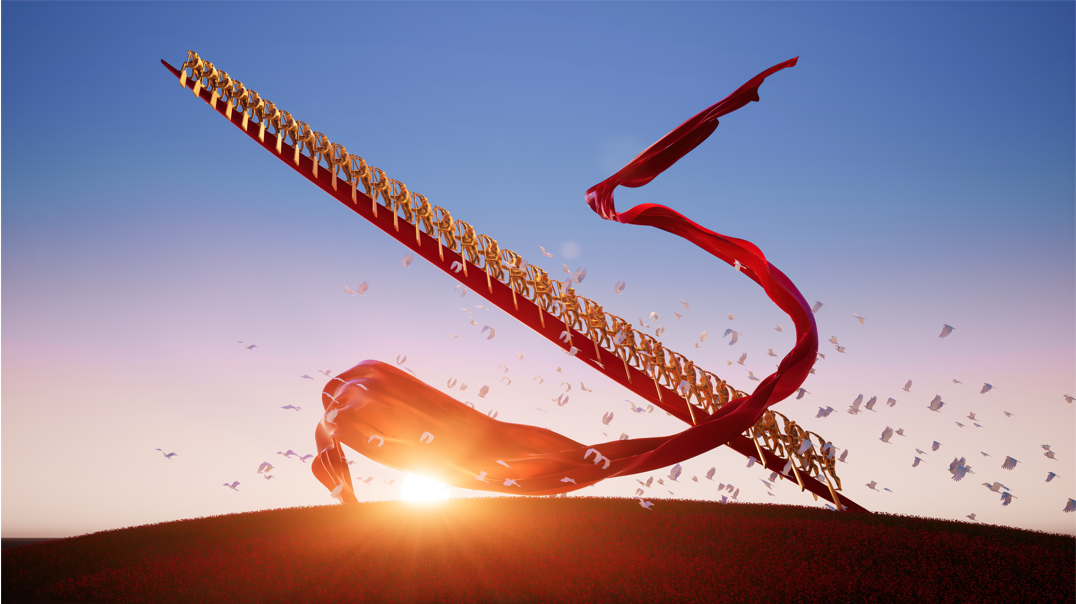 以全球化的艺术语言,把红船、巨轮、龙舟、方舟、神舟的象征意义与形态概括提炼为国际化雕塑——命运之舟,舟上有奋进划桨的十八组黄、白、黑、棕色人种,共计72位,是世界人民风雨同舟,命运与共的象征。72在中国文化中是最吉祥的数字,将舟作为人类文明的象征连接此岸与彼岸,连接文明与荒蛮,连接广袤的宇宙,载来文明送来曙光。舟行七千年历史,厚载五千年文化的深层意义突显出来,它载着世界人民的伟大梦想,驶向命运与共的光辉,将中华民族与世界人民同舟共济、拼搏奋进、乘风破浪的壮丽史诗写在浩瀚无垠的太空与人类文明史上。