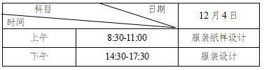 考试所需绘画工具、剪裁工具等自备。服装工艺考试具体时间、地点详细安排由考点另行公布,服装设计、服装纸样设计考试时间统一安排如下: