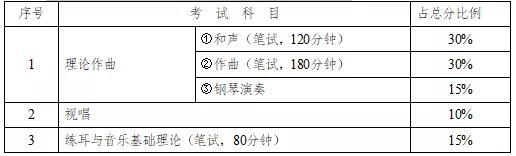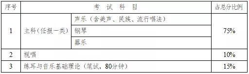 (1)考试科目及分值音乐类专业考试成绩总分为300分,具体考试科目根据主科所报类别的不同,分为两种类型: