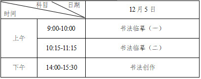 2.考试地点及时间安排书法艺术和书法教育类考试全省考生随机编排在长沙市内若干考点,具体考试地点安排见《专业考试证》。考生须在考试前3天开始登录“报名缴费指定系统”打印《专业考试证》,12月4日下午17时-18时期间考生可前往考试地点熟悉笔试考场,但不能进入考室。考生必须凭第二代居民身份证以及《专业考试证》在规定的时间和地点参加专业考试。考试时间具体安排如下: