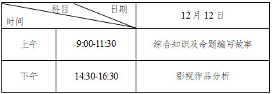 考试时间统一为2021年12月12日,考生须在考试前3天开始登录“报名缴费指定系统”打印《专业考试证》,11日下午17时-18时期间前往考试地点熟悉笔试考场,但不能进入考室。“综合知识及命题编写故事”科目开考15分钟(12日上午9∶15)后,考生不得进入考室;“影视作品分析”科目开考前15分钟(12日下午14∶15)后,考生不得进入考室。考生必须凭第二代居民身份证以及《专业考试证》在规定的时间和地点参加专业考试。其中笔试时间统一安排如下:
