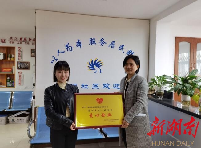 (创远社区党委书记汤丽莎为爱心企业授予牌匾)