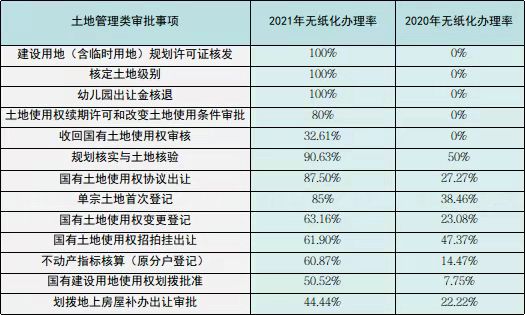 (2020至2021年土地管理类部分审批事项无纸化办理情况)