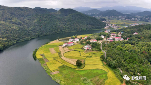 金黄色的稻田与周围的山、水美景相互呼应,构成一幅美不胜收的丰收画卷。