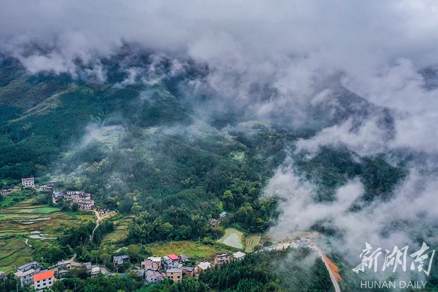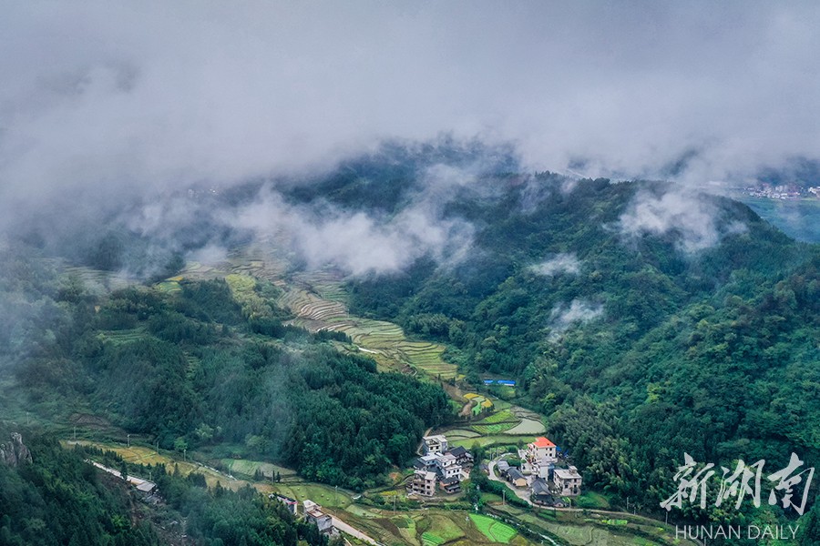 11月1日,雨后的蓝山县所城镇万年村云雾缭绕,青山、田野、民居在云雾中若隐若现,构成一幅美丽的生态画卷。彭华 摄