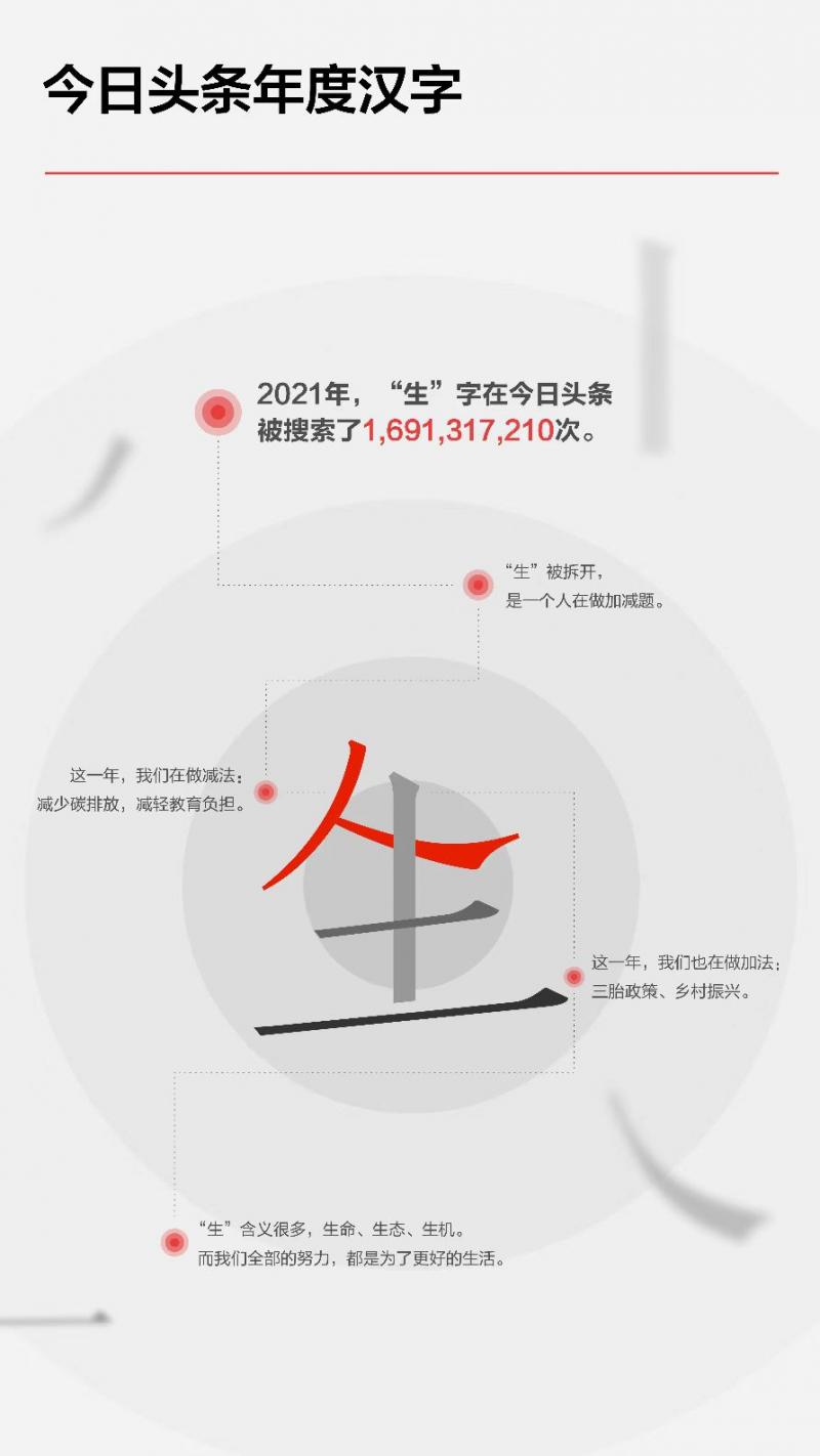 新湖南客户端12月29日讯(记者 贺志平)12月29日,今日头条发布2021年度搜索报告。报告涉及年度热门词语、新闻、人物等方面。其中“生”字全年搜索量16.9亿次,当选为年度汉字。搜索发现很多年度热词都与“生”字有关:“疫苗”拯救生命、“双碳”政策关乎生态建设,“奥运”和“乡村振兴”的新闻,则展现出2021年生机勃勃的一面。