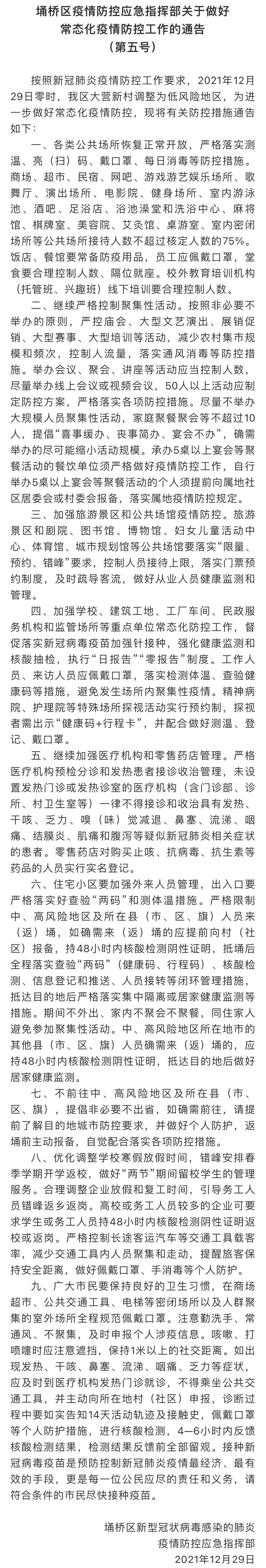 12月29日,安徽省宿州市埇桥区新型冠状病毒感染的肺炎疫情防控应急指挥部发布通告称,按照新冠肺炎疫情防控工作要求,2021年12月29日零时,宿州市埇桥区大营新村调整为低风险地区,为进一步做好常态化疫情防控,发布有关防控措施的通告。通告中明确,各类公共场所恢复正常开放,严格落实测温、亮(扫)码、戴口罩、每日消毒等防控措施。通告全文如下:
