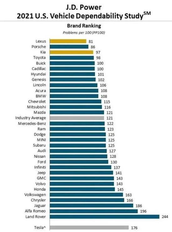 日前美国权威机构《消费者报告》推出了2021年汽车可靠性调查报告,特斯拉的成绩和去年一样,可靠性倒数第二,仅高于林肯汽车。J.D。 Power的数据也显示,特斯拉汽车的故障率非常高。