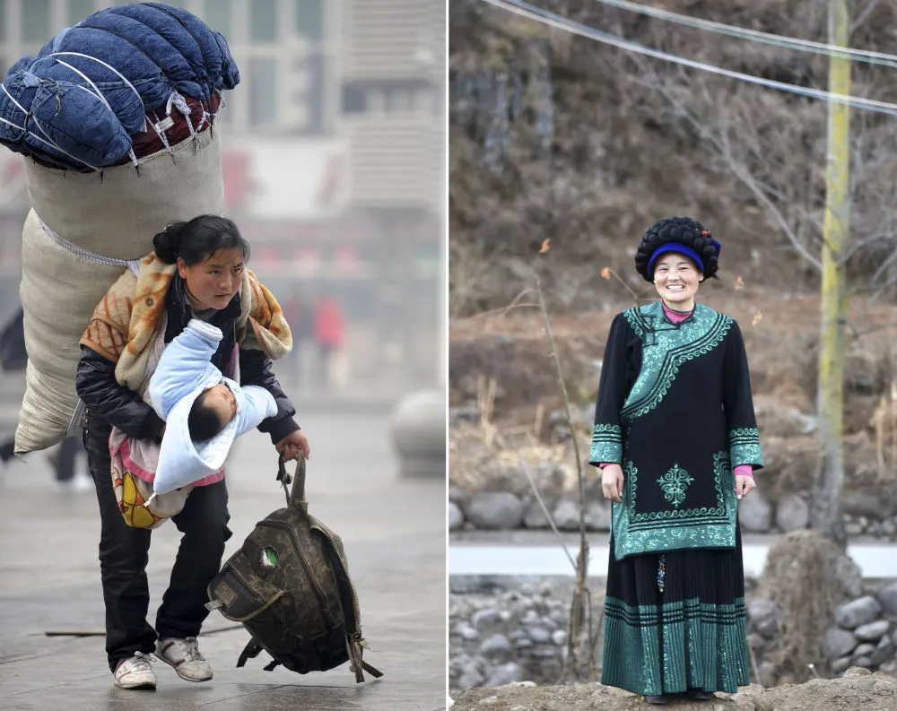 左图为黄文秀的父亲黄忠杰在表彰大会上;右图为黄文秀生前工作照