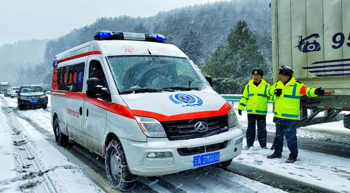12月26日,在沪昆高速玉凯段,贵州省交通执法人员为一辆护送危重病人的云A牌救护车装上防滑链,并护航救护车顺利通过堵塞路段。(贵州省交通运输厅 供图)