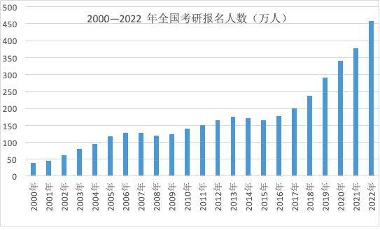 今年,全国报考人数为457万,比2021年增长80万。实际上,自2016年起,我国硕士研究生报考人数在高位上保持高增长趋势。2015-2022年,7年平均增长15.8%。