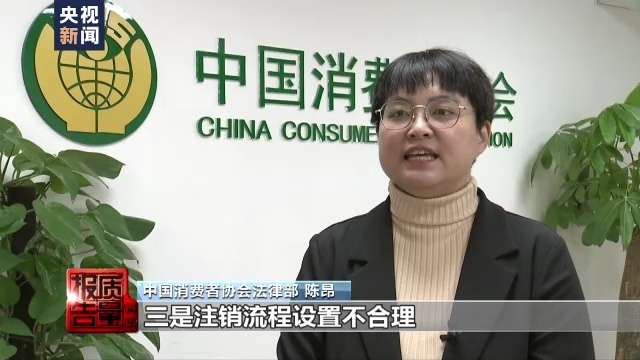 中国消费者协会法律部 陈昂:存在的主要问题为一是未注明注销条件;二是注销条件设置不合理;三是注销流程设置不合理;四是经人工审核方可注销,但人工审核存在无人受理、承诺时限过长或者承诺时限不明的情况;五是无法通过App直接注销。