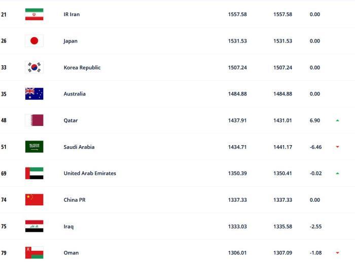 伊朗(21)与日本(26)这两支亚洲劲旅进入世界前30。进入亚洲前十的还包括韩国(33)、澳大利亚(35)、卡塔尔(48)、沙特(51)、阿联酋(69)、中国(74)、伊拉克(75)、阿曼(79)。