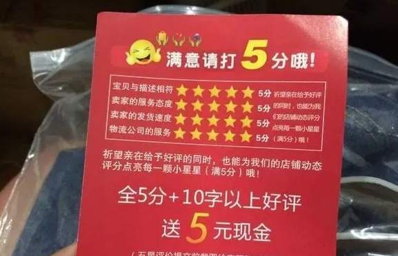 所谓“好评返现”,是一种变相购买消费者好评的行为。在网购的包裹内塞上小纸片,只要五星好评加上图文评价,就能返回若干现金,这在热衷网购的国人看来是再正常不过的事。