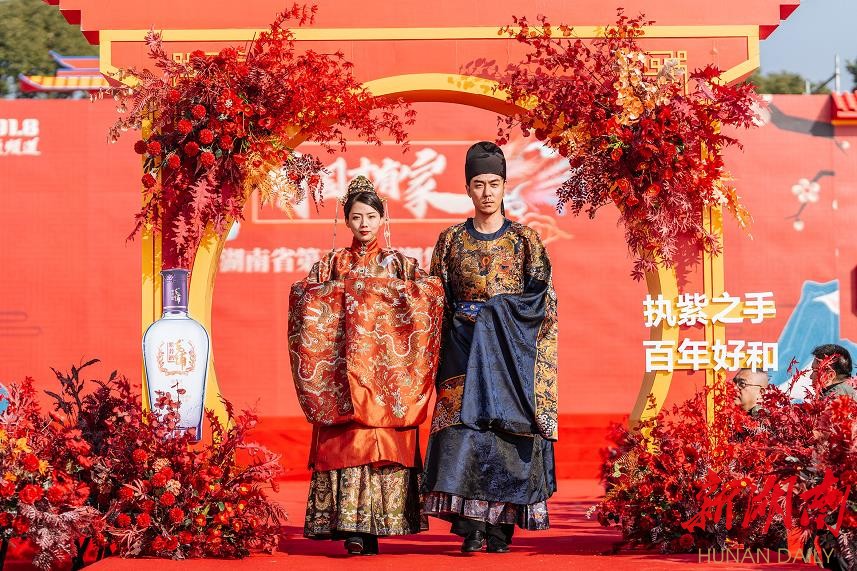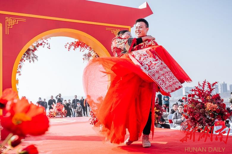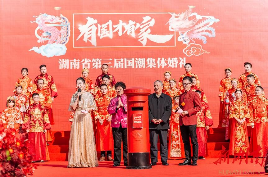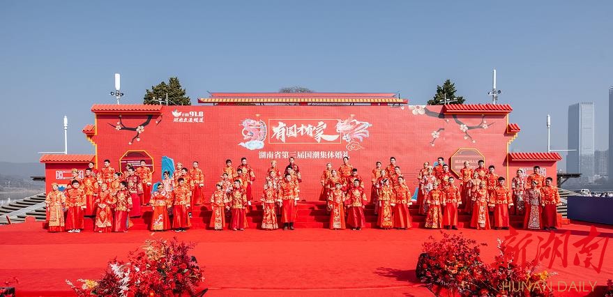湖南日报·新湖南客户端12月22日讯(记者 朱玉文 通讯员 袁三林)今天上午,“有国才有家——湖南省第三届国潮集体婚礼”在长沙橘子洲头举行。100位新人共同行交拜礼、执手礼、合卺礼……以一种独具东方美学气韵的形式,许下爱国爱家、相守一生的庄严承诺。