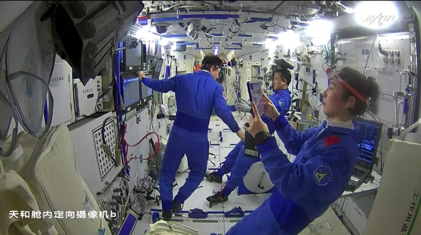 中国航天员在“天和”核心舱中执行任务。