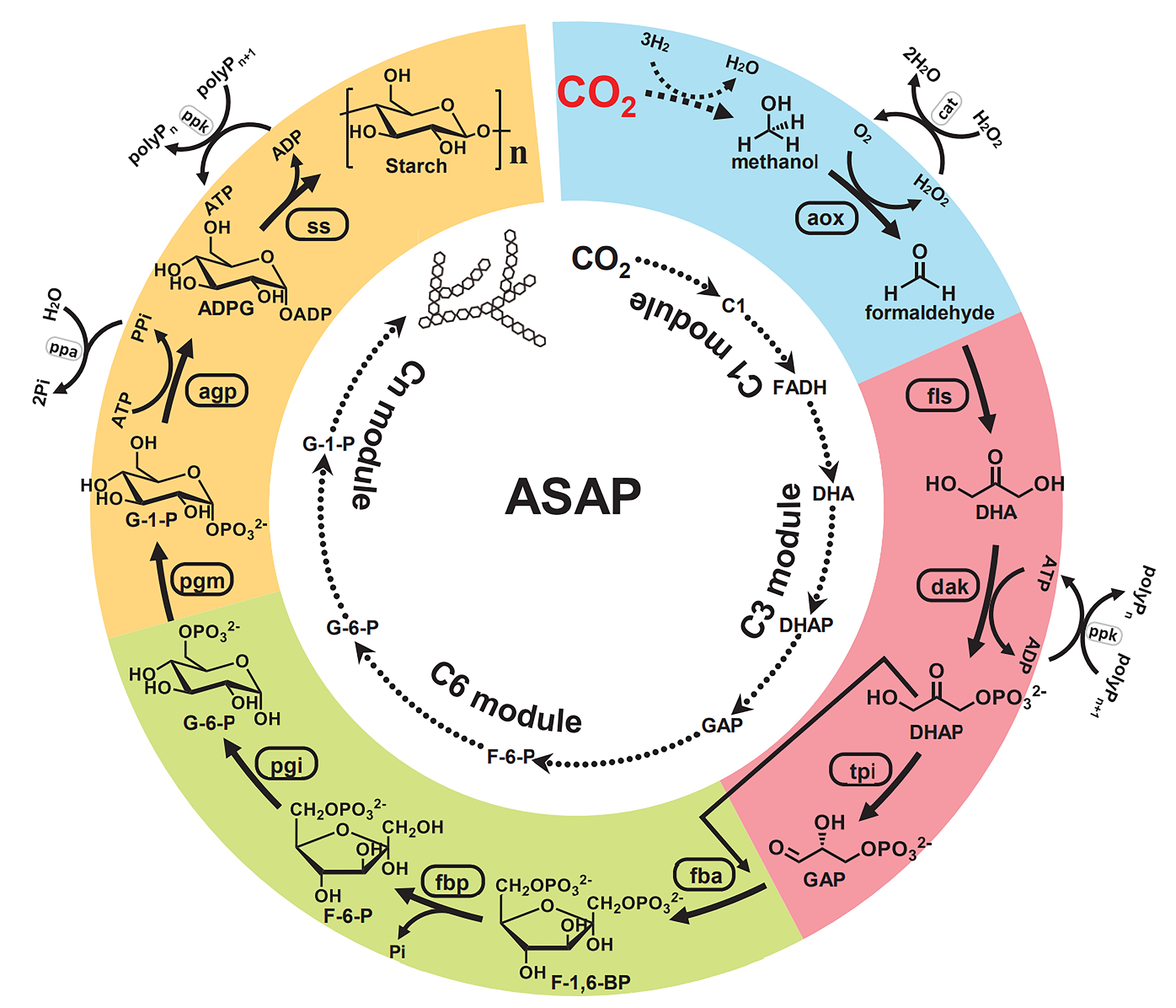 人工从头合成淀粉的11步反应路径图。