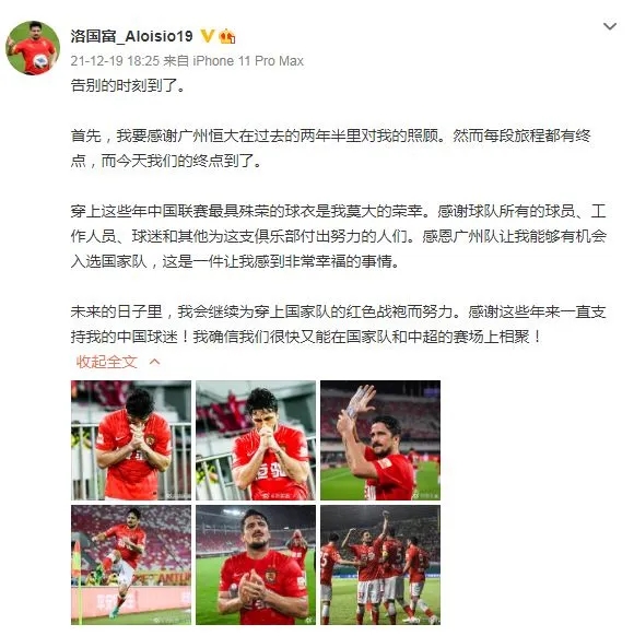19日晚,当广州队与长春亚泰队比赛进行至第25分钟时,洛国富在个人社交媒体发文向中国球迷告别。