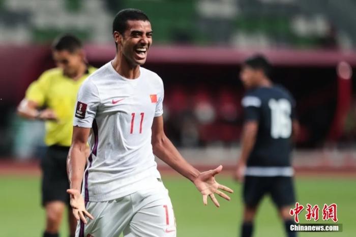 资料图:5月30日,2022世预赛亚洲区A组的一场比赛中,中国男足7:0大胜关岛队。图为阿兰在比赛中庆祝进球。图片来源:视觉中国