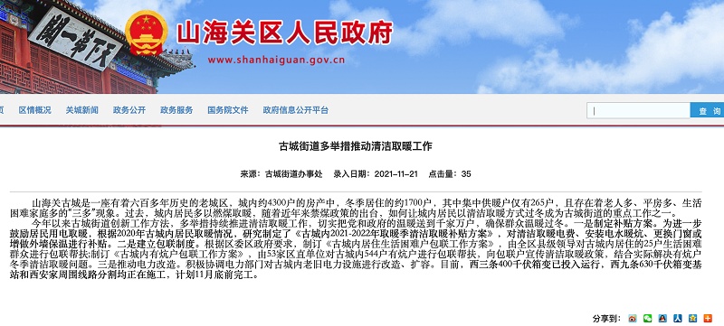 山海关古城是一座有着六百多年历史的老城区。古城内约4300户的房产中,冬季居住的约1700户,其中集中供暖户仅有265户,且存在着老人多、平房多、生活困难家庭多的“三多”现象。