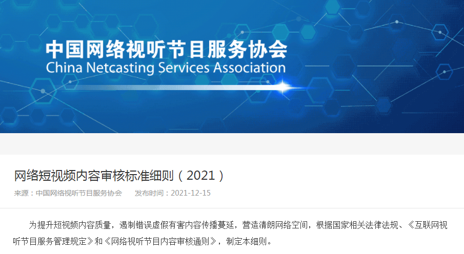 12月15日,中国网络视听节目服务协会发布《细则》。当天,国家广播电视总局也在官网发布了这一《细则》。