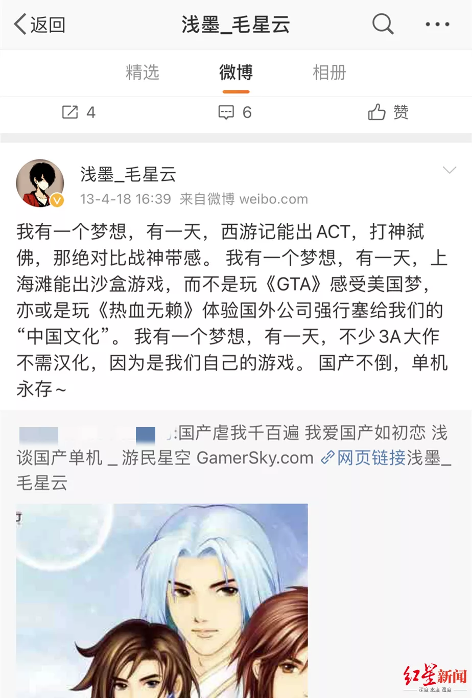 此外,毛星云也时常在微博上鼓励同行后辈,告诉对方“兴趣和热情是最好的老师”。2013年,其还曾在社交平台上谈及自己的梦想:“我有一个梦想,有一天,西游记能出ACT,打神弑佛,那绝对比战神带感。我有一个梦想,有一天,上海滩能出沙盒游戏,而不是玩《GTA》感受美国梦,亦或是玩《热血无赖》体验国外公司强行塞给我们的‘中国文化’。我有一个梦想,有一天,不少3A大作不需汉化,因为是我们自己的游戏。我有一个梦想,将来的某一天,国产游戏能像中国的其他产业一样,以一个领跑者的姿态,面对全世界,面对全宇宙,气宇轩昂,扬眉吐气。国产不倒,单机永存。等着我们的好消息!”