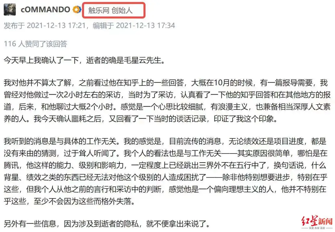 知乎上,认证为触乐网创始人的用户发文表示,逝者为毛星云