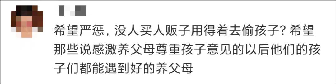 不少网友指出,作为罪魁祸首的人贩子必须严惩,而在实质上属于“买家”的“养父母”也绝不能姑息。