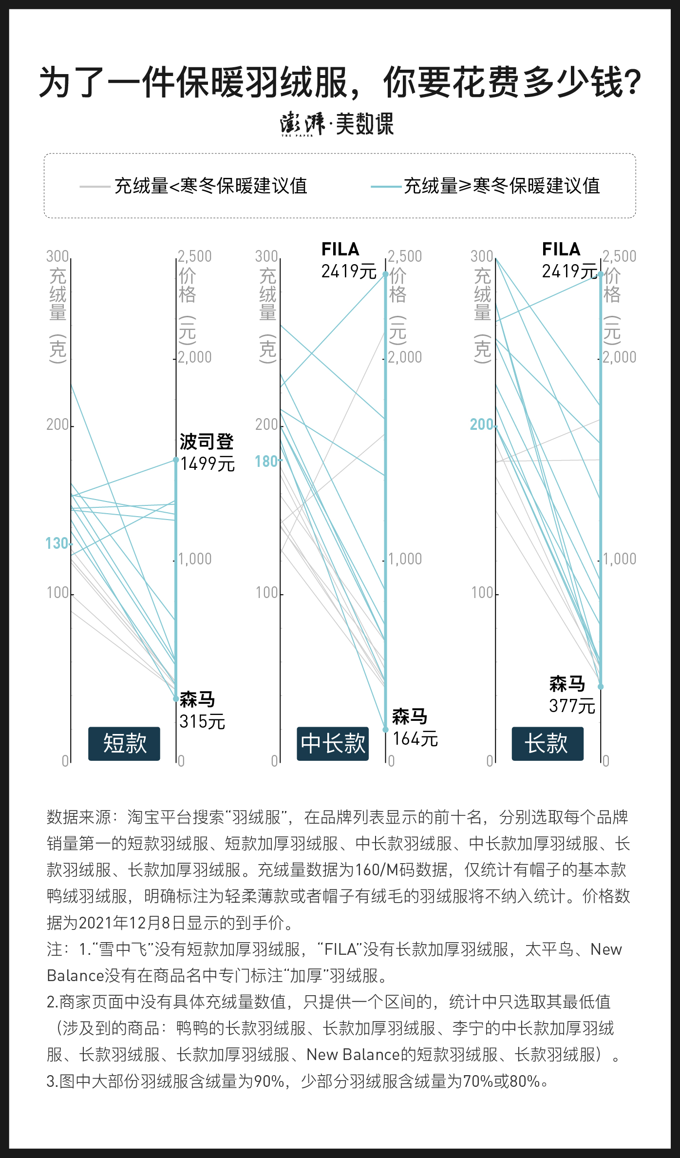 不过,保暖性达标的羽绒衣,价格差异却不小。澎湃新闻记者分别整理了十个羽绒服品牌的热销短款、中长款、长款羽绒服,共计52款羽绒服,发现达到寒冬保暖标准的羽绒服价格从300元至上千元不等。