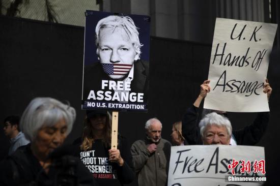 资料图:美国旧金山湾区民众在英国驻旧金山总领事馆外集会,要求释放阿桑奇。中新社记者 刘关关 摄