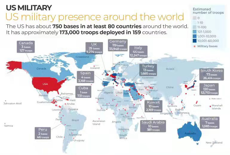 截至2021年10月,美国仍然在至少80个国家和地区维持着大约750个海外军事基地,其中有120个在日本,73个在韩国。美国昆西国家事务研究所的报告指出,“美国的海外军事基地常常会加剧地缘政治紧张局势,支持非民主政权。此外,美国的驻外军事基地使美国更容易发动和执行灾难性的战争,包括在阿富汗、伊拉克、也门、索马里和利比亚的战争等。”