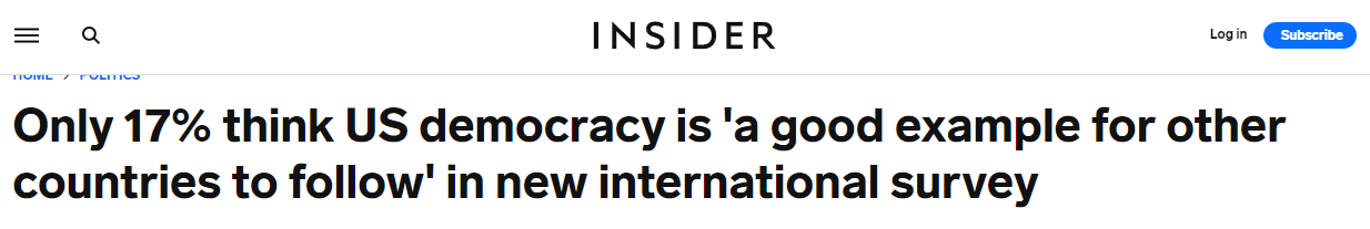 美国民主2021年表现成这样,在自己国家也失去了民心。皮尤研究中心报告显示,绝大多数美国人对自己国家的政治制度深感失望。只有17%的人认为美国的民主值得效仿,而23%的人认为美国的民主从来不是什么好例子。美国全国公共广播电台近期的民调也显示,81%的美国民众认为美民主面临严重威胁。