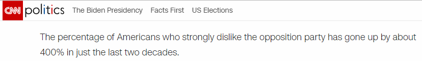 △CNN报道说,过去二十年间美国人厌恶对方政党的比例飙升了400%。
