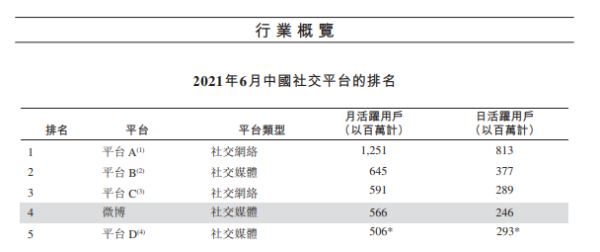 根据灼识咨询的报告,按照2021年6月的月活跃用户和日活跃用户计,微博在中国社交平台中排名第四,落后于微信、抖音、QQ,且身后的快手紧追不舍,日活用户已经赶超微博。
