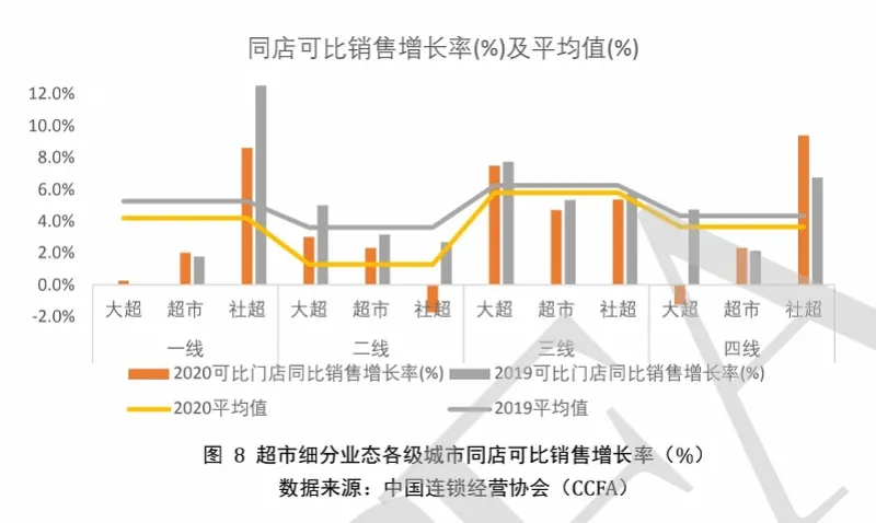 根据中国连锁协会前不久发布的《连锁超市经营情况报告(2021)》显示,6000平方米以上的大型超市在中国超市百强企业3.1万家的总门店中,占比降至14%,而面积小于2000平方米的社区超市占比超过七成。2020年大型超市可比门店同比销售增长率甚至不足1%。