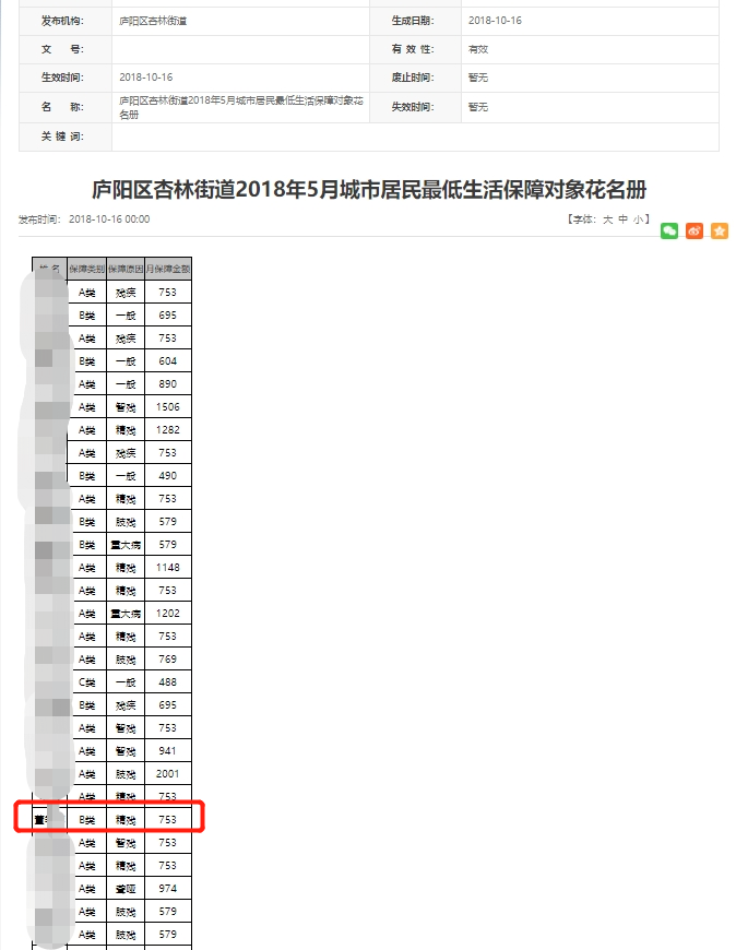 庐阳区政府网站公布的杏林街道2018年5月城市居民最低生活保障对象花名册中,也有董某萍,当时她的保障类别是B类,保障原因为“精残”,保障金额为753元。