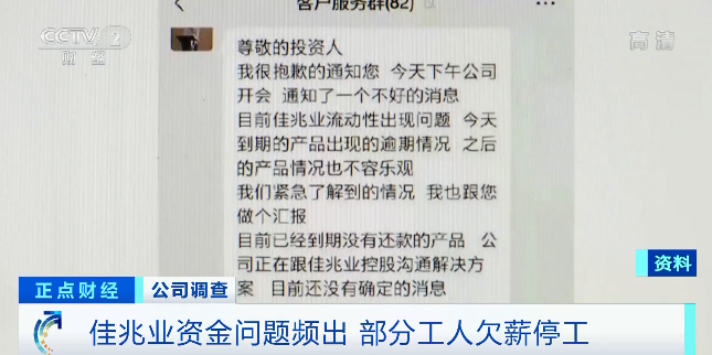 业内人士表示,佳兆业出现欠薪停工等现象的根本原因是其资金链出现了问题。据了解,佳兆业是深圳的房地产龙头企业之一,11月4日,由锦恒财富发行、佳兆业集团担保的理财产品出现兑付逾期,引发行业内外广泛关注。根据佳兆业方面公布的数据,锦恒财富目前到期未兑付逾3亿元,理财产品总金额约为127亿元。根据国家统计局发布的数据,今年10月全国商品房销售金额、面积分别同比下降22.6%和21.7%,房地产市场降温明显。