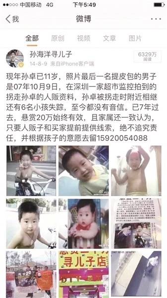 孙海洋悬赏20万希望找到孩子。