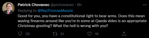 综合“今日俄罗斯”(RT)、路透社报道,美国肯塔基州一共和党议员托马斯·马西当地时间4日在其推特账号上发布了一张全家庆祝圣诞的合照,值得注意的是,照片中每个人都各持一把枪“微笑地摆着姿势”,这一举动引发其同僚、网友的强烈批评,有网友就发问:你们到底有什么毛病?