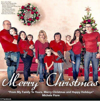 值得注意的是,这不是美国有议员政客第一次在圣诞节前后发布这样“荷枪实弹”的全家福。据报道,2015年圣诞前夕,美国内华达州的共和党女州众议员蜜雪儿·费奥里曾在社交网络上贴出一张节日拥枪的全家福。照片中,10个家庭成员除婴幼儿外,其他人全都持枪。照片中人人身穿蓝色牛仔裤,上身为红色。照片下方是一段问候语:“费奥里全家向各位致意,祝大家圣诞快乐,佳节愉快!”费奥里当时表示,这张节日照片是为了表明其对美国宪法第二修正案的支持。↓