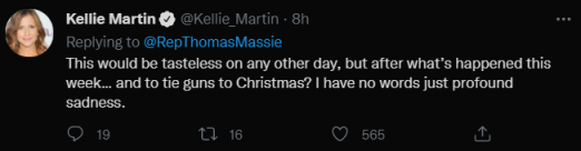 有网友认为马西此举时间点很不合适:“这在其他时候可能没什么反应,但在这周发生的事后... 把枪和圣诞绑定在一块?我无话可说,只有强烈的悲伤。”↓